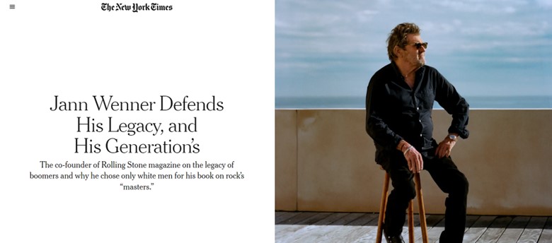 Wenner said these performers weren’t part of the “zeitgeist” of the time and weren’t “articulate enough” intellectually. The interview sparked a blowtorch of criticism. (David Marchese, “Jann Wenner Defends His Legacy, and His Generation’s,” New York Times, Sept. 15, 2023, online.)